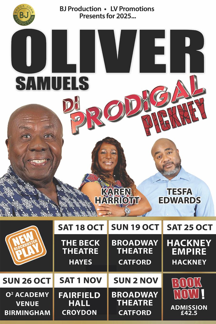 Caribbean theatre legend Oliver Samuels returns to the UK stage in 2025 with his brand-new blockbuster comedy play, DJ Prodigal Pickney. Known for his unmatched wit and captivating performances, Oliver leads an all-star cast featuring Karen Harriott and Tesfa Edwards, bringing audiences an unforgettable night of laughter, culture, and storytelling.